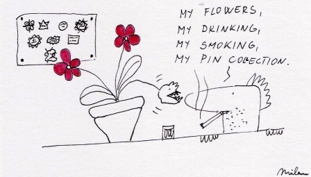 He couldn’t wait to get home and feed his plants, or get to the garage, or trade some pins. And of course to have a drink and cigarette.